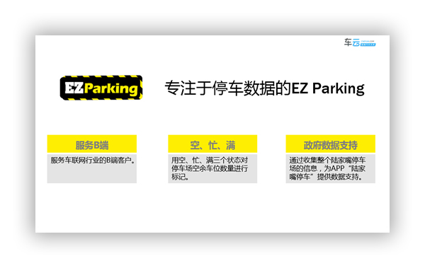 成立于2009年的EZ Parking,一直定位于服務車聯網行業的B端客戶,包括車企和圖商等,B端客戶將EZ Parking的數據整合到車載終端上,提供給C端用戶使用。在停車場數據方面,EZ Parking可以提供15個城市,超過2萬個停車場的數據信息;在服務車企方面,服務企業有觀致、奔馳(進口奔馳和國產奔馳)、斯巴魯等;服務圖商方面,將為百度地圖和高德地圖提供停車場信息。根據規劃,EZ Parking計劃每年擴張五個城市的停車場數據,已有城市同樣會不斷增加更多停車場的信息。